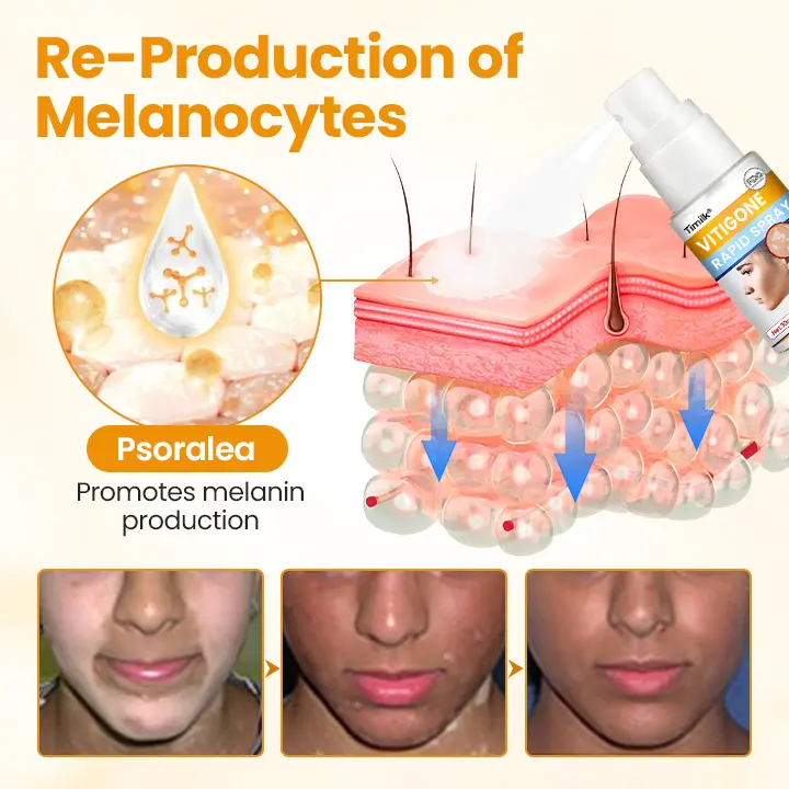Mae Chwistrell Cyflym Timilk® VitiGone wedi'i datblygu gyda Thechnoleg Treiddiad Targedu Cwantwm unigryw, sy'n galluogi cynhwysion llysieuol bioactif i groesi pilenni lipid a chyrraedd yr epidermis gwaelodol. Mae'r broses hon yn ail-actifadu melanocytau, yn rheoleiddio gweithgaredd imiwnedd, ac yn atgyweirio celloedd croen sydd wedi'u difrodi, gan ddarparu dull effeithiol o reoli vitiligo.